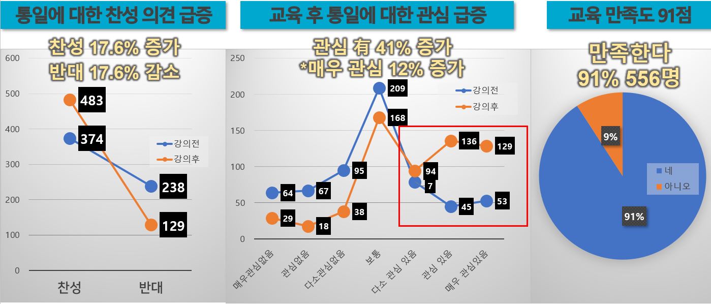 설문 결과, 수업에 참여한 91% 학생이 교육에 만족했다고 답했다. 특히 교육 전보다 통일에 대한 관심이 높아졌다고 41%가 응답했다. 통일에 대한 인식이 점차 낮아지는 세대임에도 교육 후 통일에 대한 찬성 비율이 17.6% 높아졌다.