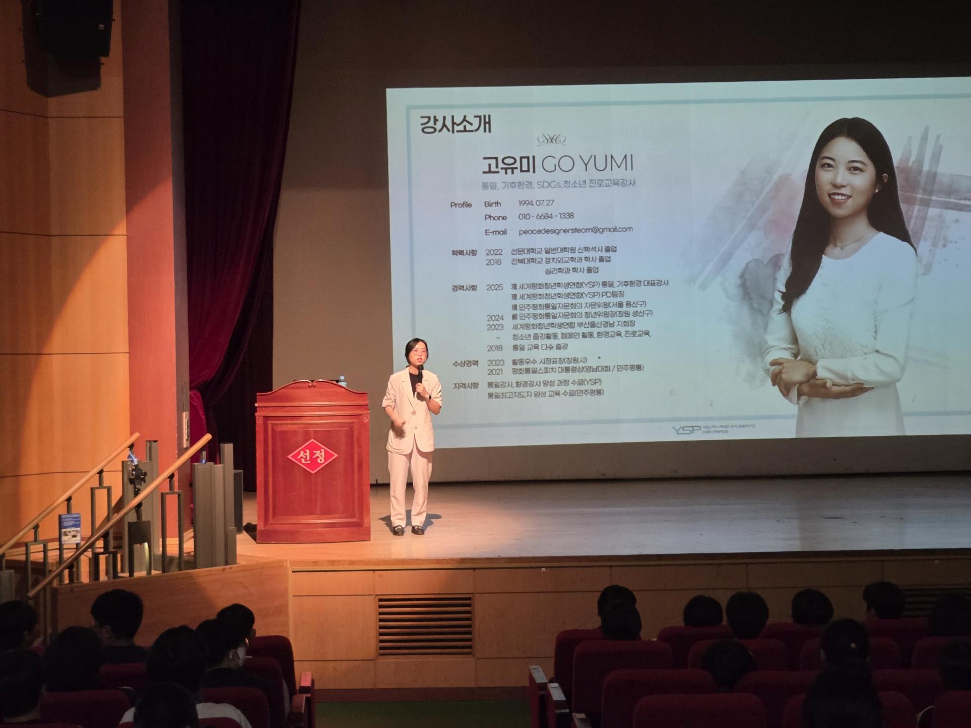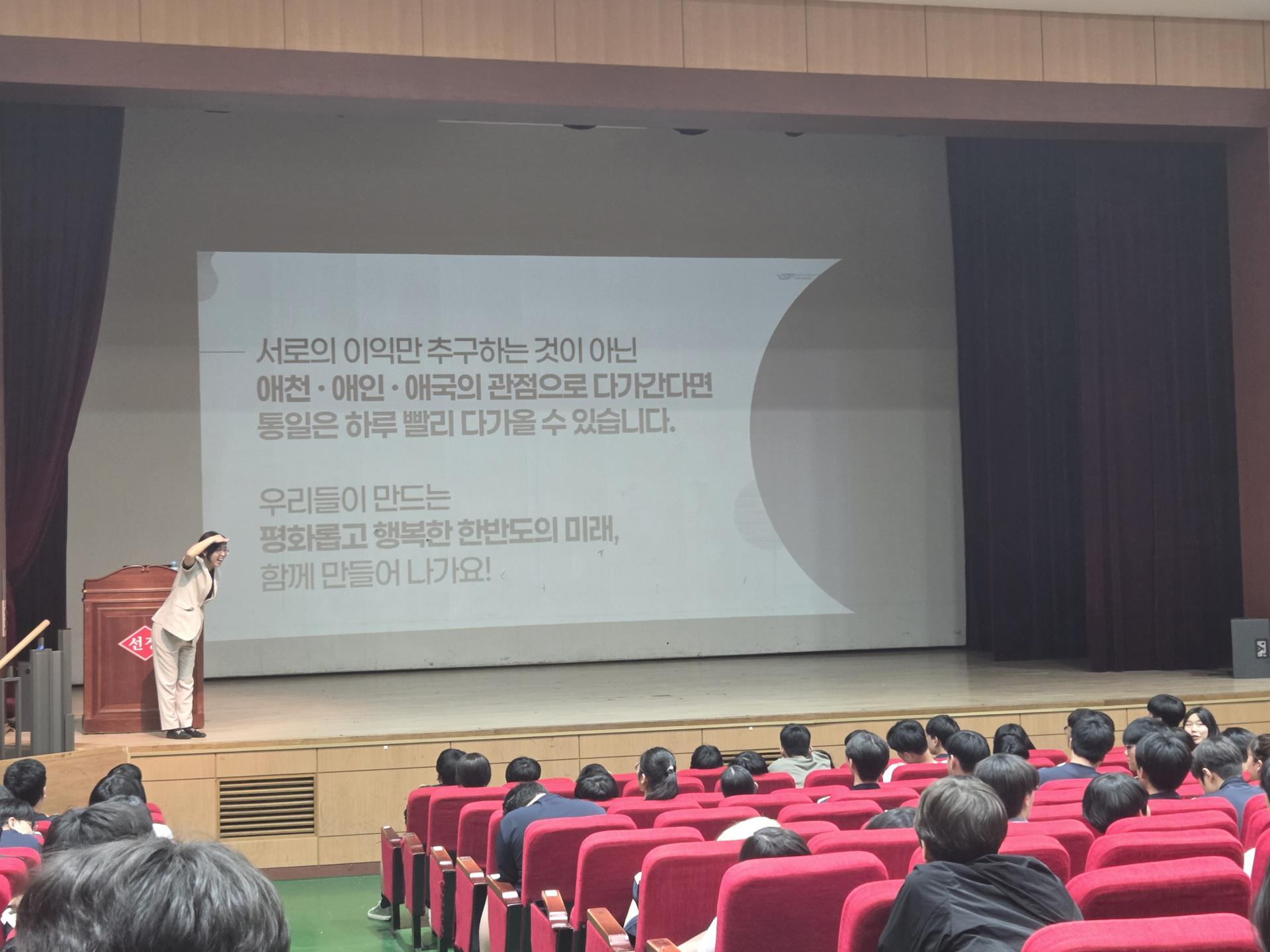 - " 통일교육 수업을 통해 분단의 역사와 현재 한반도의 상황에 대해 더 깊이 이해할 수 있었습니다. 특히 통일이 단순한 정치적 사건이 아니라 우리 모두의 삶과 미래에 직결된 문제라는 점이 인상 깊었습니다. 앞으로 통일에 대해 더 관심을 가지고, 평화로운 한반도를 위한 역할을 고민해보고 싶습니다. (선정중 1학년 김00) "
