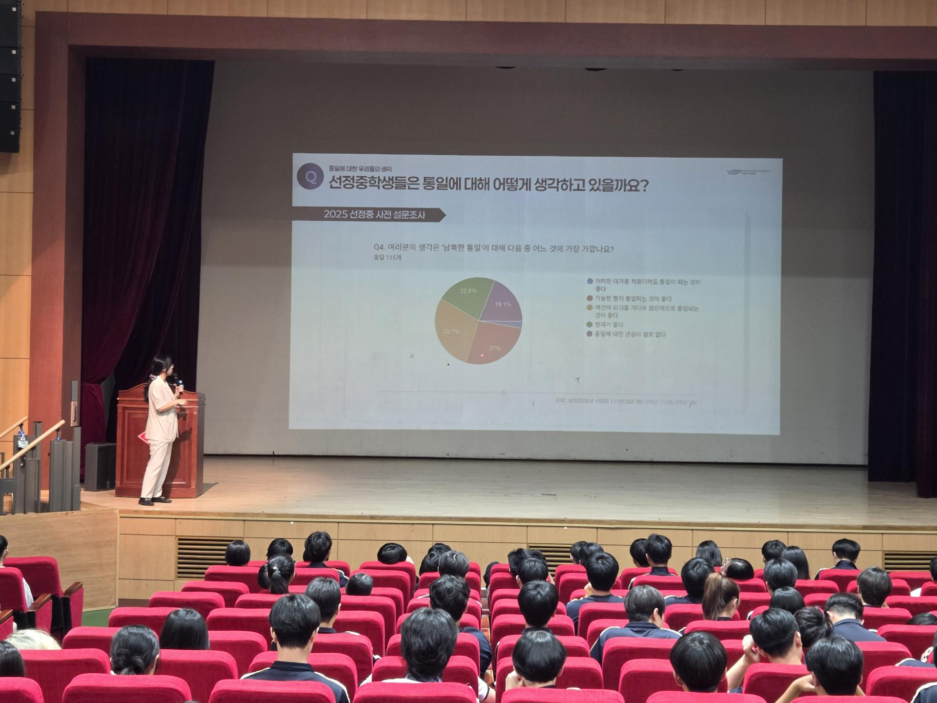 이후, 사전에 선정중학생들을 대상으로 실시한 '통일인식조사' 결과를 공유해주셨는데요.